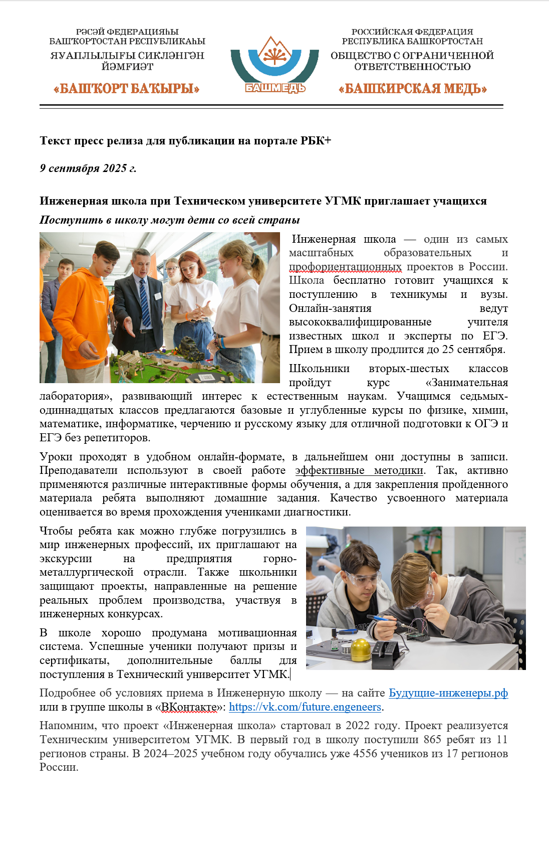Напомним, что проект «Инженерная школа» стартовал в 2022 году. Проект реализуется Техническим университетом УГМК. В первый год в школу поступили 865 ребят из 11 регионов страны. В 2024–2025 учебном году обучались уже 4556 учеников из 17 регионов России.