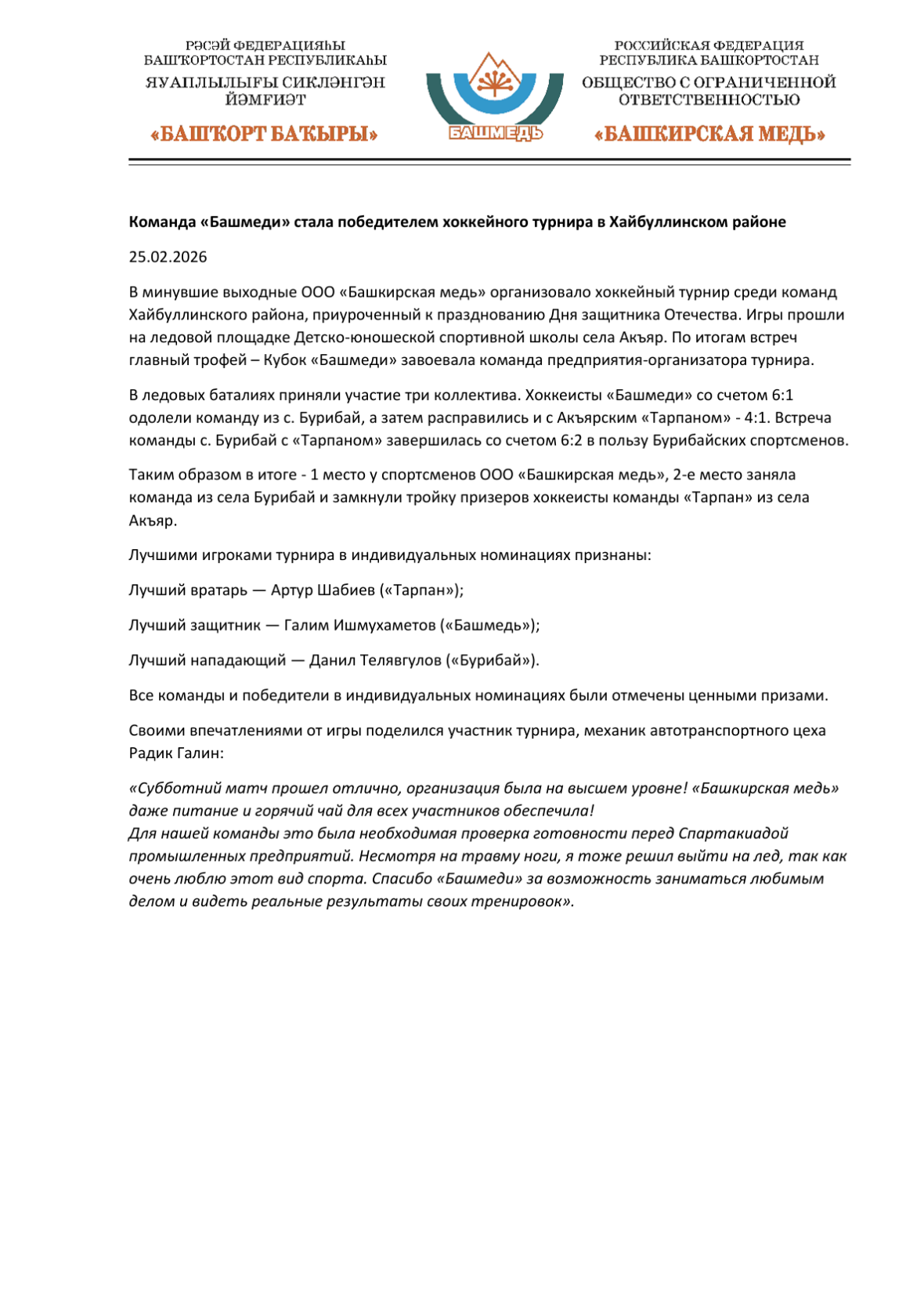 Игры прошли на ледовой площадке Детско-юношеской спортивной школы села Акъяр. По итогам встреч главный трофей — Кубок «Башмеди» — завоевала команда предприятия — организатора турнира.