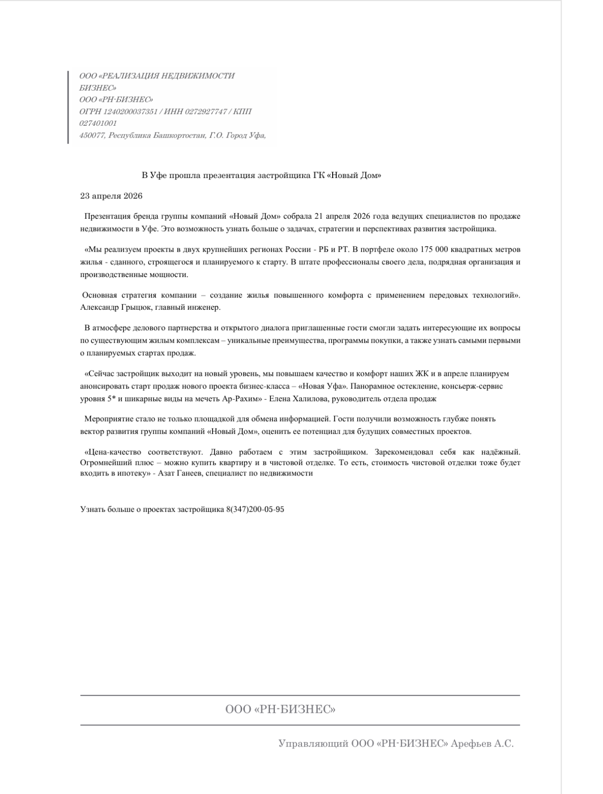 «Сейчас застройщик выходит на новый уровень, мы повышаем качество и комфорт наших ЖК и в апреле планируем анонсировать старт продаж нового проекта бизнес-класса — “Новая Уфа”. Панорамное остекление, консьерж-сервис уровня 5* и шикарные виды на мечеть “Ар-Рахим”», — говорит руководитель отдела продаж Елена Халилова.